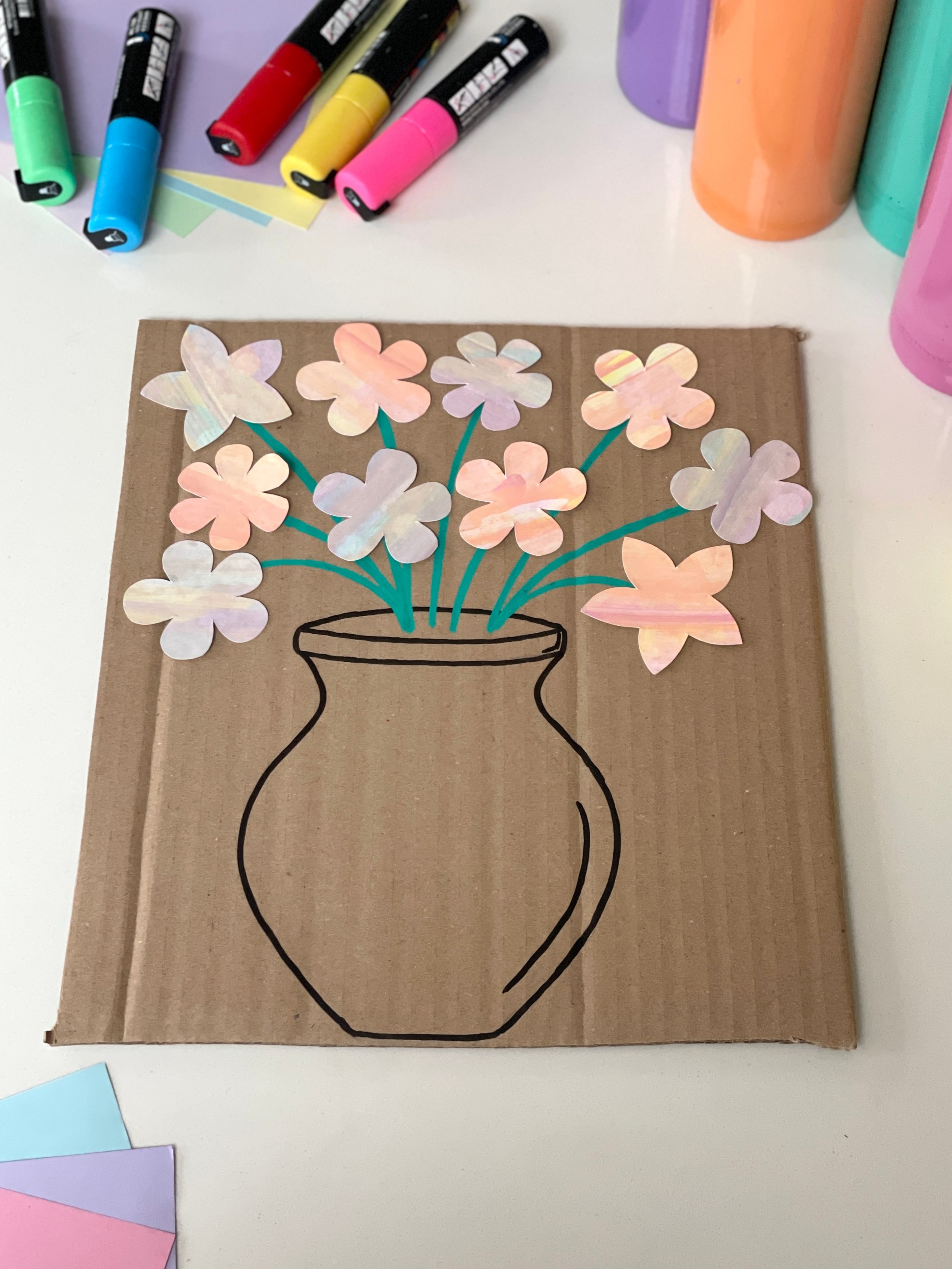 On a separate piece of cardboard or card draw a vase on the bottom section and green stems.
